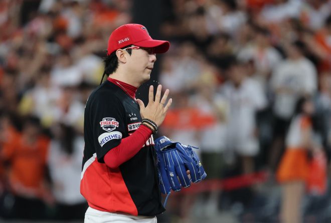 땀 나는 양현종 - (대전=뉴스1) 김기태 기자 = 9일 오후 대전 한화생명 볼파크에서 열린 프로야구 ‘2025 신한 SOL뱅크 KBO 리그’ 기아 타이거즈와 한화 이글스 경기에서 4회말 2사 1, 3루 상황 한화 최재훈이 3점 홈런을 맞은 기아 양현종이 땀을 닦고 있다. 2025.7.9/뉴스1