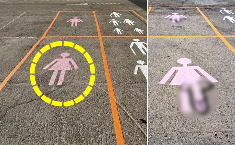 스페인 북서부 레온시 곳곳에 생긴 여성 전용 주차 공간. 왼쪽 사진은 시가 이 정책을 시행한 지 일주일 만에 분홍색 여성 이미지에 남성 성기가 덧그려진 모습. 사진 엑스(X) 캡처