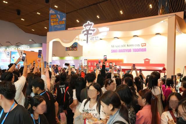 지난 6월 한국관광공사 하노이지사에서 개최한 호치민 K-관광로드쇼 농심 이벤트 부스에서 베트남 사람들이 불닭볶음면 시식을 기다리고 있다. [사진=한국관광공사] |