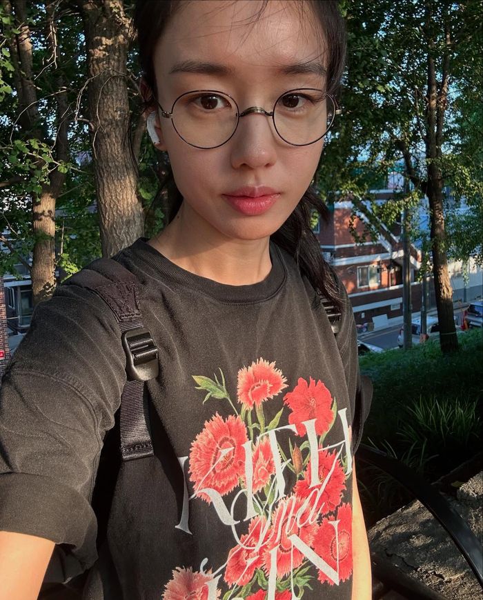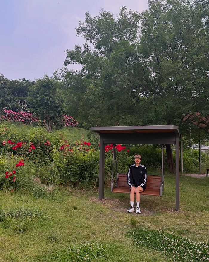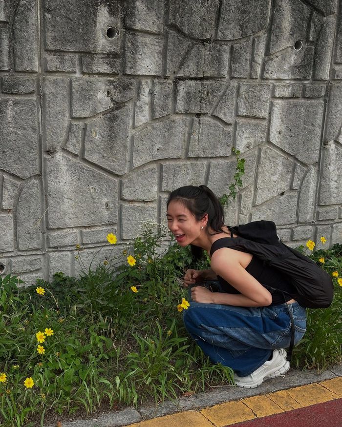 다른 사진에서는 캐주얼한 복장으로 야외 산책을 즐기고 있다. 검은색 티셔츠와 백팩, 청바지로 편안한 스타일을 완성했으며, 길가의 노란 꽃을 바라보며 환하게 미소 짓는 등 자연과 어우러진 일상에서 특별한 여