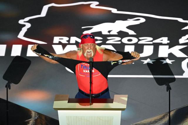 2024년 미국 공화당 전당대회 행사장에서 티셔츠를 찢는 퍼포먼스를 한 프로레슬러 헐크 호건. AFP 연합뉴스