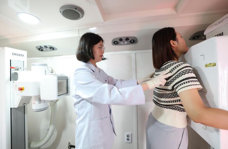 27일 오전 서울 강남구 코엑스 광장에서 열린 ’폐 건강 체크버스 캠페인‘에서 한 시민이 무료 흉부 엑스레이를 촬영하고 있다. 이번 캠페인은 한국아스트라제네카가 대한결핵협회, 마이허브와 손잡고 인공지능(AI) 기반의 흉부 엑스레이 촬영이 가능한 버스를 전국적으로 운영해 인지하지 못했던 폐 결절을 조기에 발견할 수 있도록 돕기 위해 마련됐다. 2025.6.27/뉴스1 |