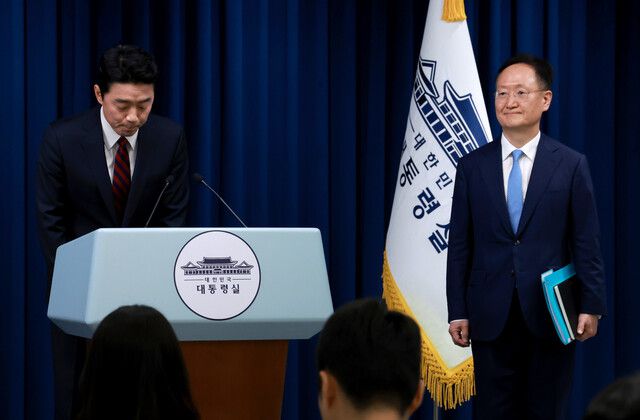 강훈식 대통령비서실장(왼쪽)이 24일 서울 용산 대통령실 청사에서 이날 열린 수석·보좌관 회의 등과 관련해 브리핑을 마친 뒤 인사하고 있다. 강 비서실장 오른쪽은 배석한 봉욱 민정수석비서관. 연합뉴스 |