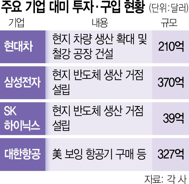 한국에도 이 같은 투자 압박이 이어지는 가운데 우리 정부는 관세 협상에 앞서 삼성과 SK·현대차·LG·롯데·포스코·한화·HD현대 등 10대 그룹과 접촉해 가용한 현지 투자 금액을 취합한 것으로 알려졌다. 현재까지 기업들이 약속한 투자 금액은 1000억 달러 수준인 것으로 전해진다.