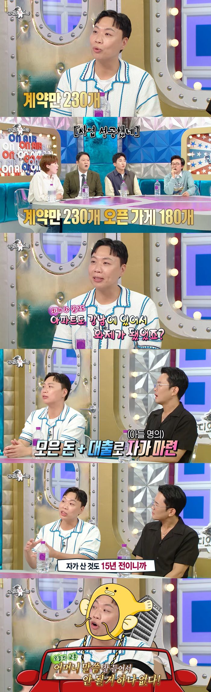 "계약이 230개고 오픈한 가게가 180개다"라며 어마어마한 사업 규모를 이야기한 이상준에 김구라는 "사실 외제차도 끌고 그런걸로 화제가 됐다"며 그의 재력을 짚었다.