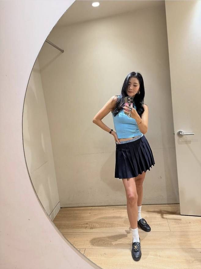 사진 속 그는 민트빛 니트에 네이비 플리츠 스커트를 더해, 청량하면서도 발랄한 여름룩을 완성했다.