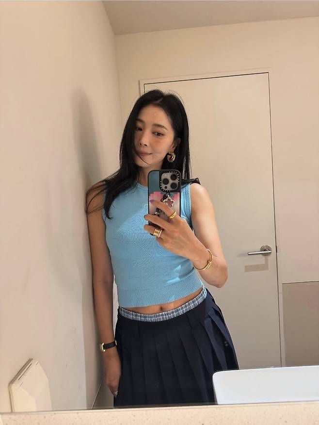 24일 오윤아는 자신의 SNS에 미니스커트와 민소매 니트 톱을 매치한 거울 셀카를 공개했다.