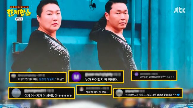 그러자 이수지는 자신의 사진을 보여주더니 “싸이”라고 속였다. 김희선이 진짜로 믿자 이수지는 “저예요. 근데 진짜 닮았죠. 싸이 형님이랑”이라고 말했다. 이에 놀란 김희선은 “분장한 거냐”라고 물었고, 이수지는 “저 아무것도 안했다. 머리 살짝 묶었다”라고 답해 웃음을 더했다.