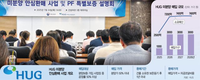 미분양 안심 환매 사업에는 총 2조 4000억 원이 투입된다. 매입 물량은 1만 가구다. 최근 정부는 추가경정예산안에 3000억 원을 반영했다. 2조 1000억 원은 HUG 자체 재원이나 채권발행 등으로 충당할 방침이다. 2025년부터 2026년까지 4000가구, 2027~2028년 6000가구 등 3년에 걸쳐 1만 가구가 순차적으로 매입한다. HUG 관계자는 “신청수요 등을 고려해 사업 초기규모를 확대해 지원하는 방안도 검토 중”이라고 설명했다.