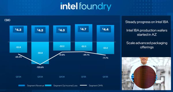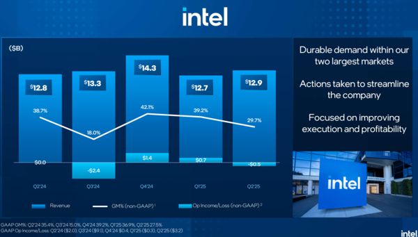 24일(현지시각) 인텔은 일반회계기준(GAAP) 2025년 2분기 매출액 128억5900만달러(약 17조6600억원) 영업손실 31억7600만달러(약 4조3600억원)를 달성했다고 밝혔다.