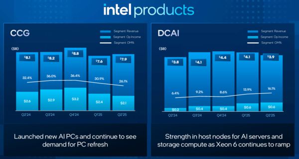 2분기 CCG 매출액과 영업이익은 각각 78억7100만달러와 20억5300만달러다. 각각 전년동기대비 3.3%와 22.3% 감소했다. DCAI 매출액과 영업이익은 각각 39억3900만달러와 6억3300만달러다. 각각 전년동기대비 3.5%와 161.6% 상승했다.