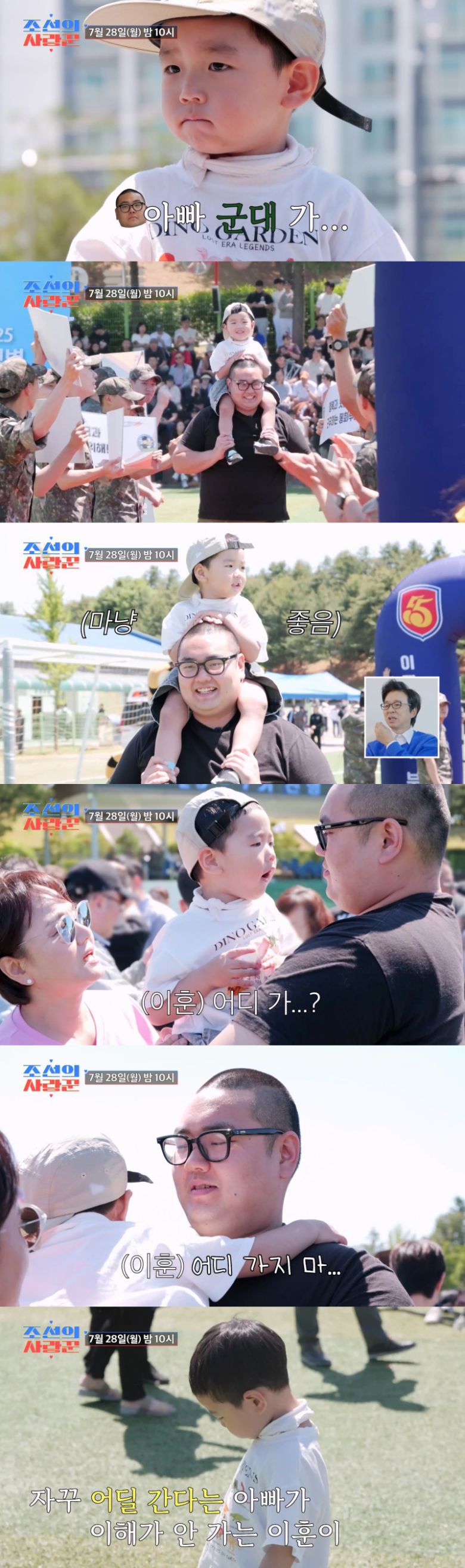 한편 화기애애한 입소식이 끝나고 이별의 시간이 다가왔다. 이훈은 "이제 다 했어, 아빠?"라며 아빠에게 달려들었지만, 손보승은 "아냐...아빠 이제 가는 거야"라며 아들을 올려 안았다. 이경실은 손자에게 "아빠한테 뽀뽀해 줘"라며 이별을 준비했다. "아빠 군대 가..."라는 손보승의 대답에 이훈은 아빠의 목을 꼭 붙잡았다.