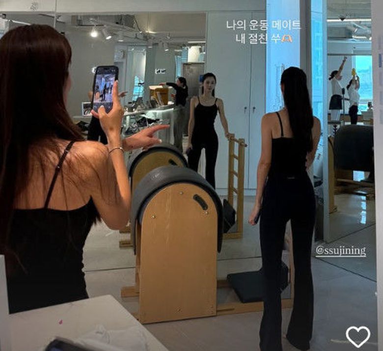 김성은은 자신의 인스타그램 스토리에 "나의 운동 메이트 내 절친 쑤"라는 글과 함께 사진을 게시했다.