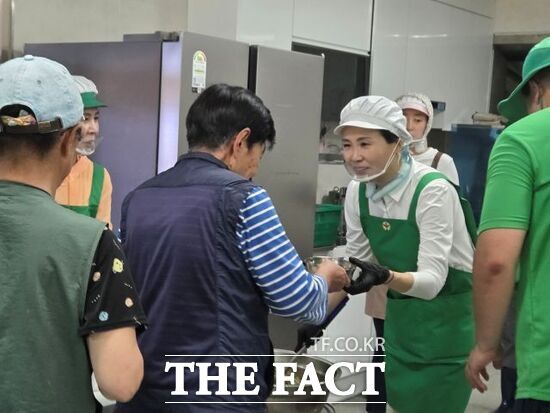 지난 24일 김혜경 여사(오른쪽 3번째)가 비공개 일정으로 경기 가평군 북면 백둔리 수해현장을 찾아 급식봉사에 참여, 수해 피해 주민들에게 배식을 하고 있다. /가평군