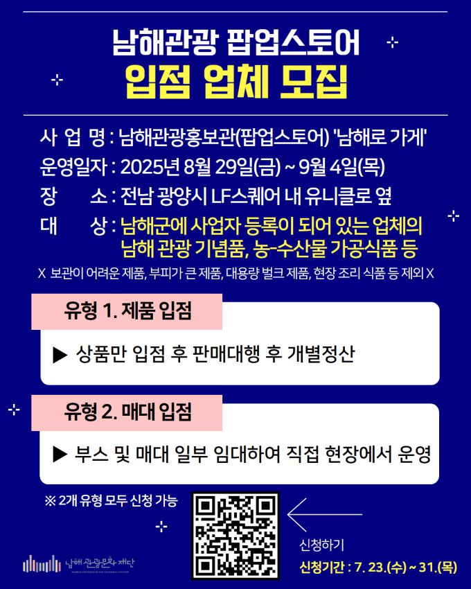 홍보관은 쇼핑몰 실내 공간에서 일주일간 마련되며, 참가 사업체는 제품 전시·홍보, 판매, 체험 프로그램 등 다양한 홍보 활동이 가능하다. 남해군에 위치한 관광 서비스, 농수산가공, 체험형 콘텐츠, 관광기념품 제작 사업체라면 누구나 신청할 수 있다.