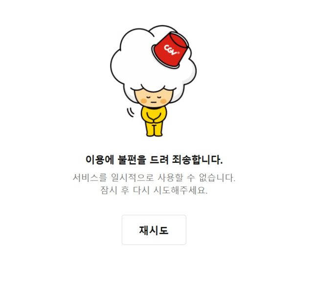 CGV 홈페이지에선 "서비스를 일시적으로 사용할 수 없다"며 "잠시 후 다시 시도해 달라"는 안내를 띄우고 있다. 모바일 앱에서도 "서비스 이용 중 불편을 드려 죄송하다. 시스템 오류로 현재 이용할 수 없다"고 안내 중이다. CGV 관계자는 "영화 6천원 할인쿠폰 다운로드 영향"이라며 "동시 접속량이 많아서인데, 조치 중"이라고 말했다.
