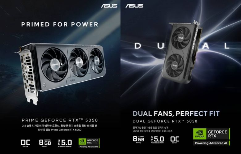 트리플 팬 디자인의 ASUS Prime 지포스 RTX 5050 OC와 소형 폼팩터에 특화된 듀얼 팬 디자인의 ASUS Dual 지포스 RTX 5050 OC는, 동일한 코어 사양(2,560 CUDA 코어, 8GB GDDR6 20Gbps)을 공유하면서도 쿨링 구조, 슬롯 두께, 시스템 활용 목적에서 콘셉트가 뚜렷이 갈린다.