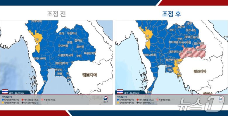 이번 조치에 따라 태국의 △수린주 △부리람주 △시사켓주 △우본라차타니주 등 4개 주에는 여행 경보 2.5단계에 해당하는 '특별여행주의보'가 발령됐고, △사께오주 △짠타부리주 △뜨랏주에는 2단계(여행 자제) 경보가 내려졌다.