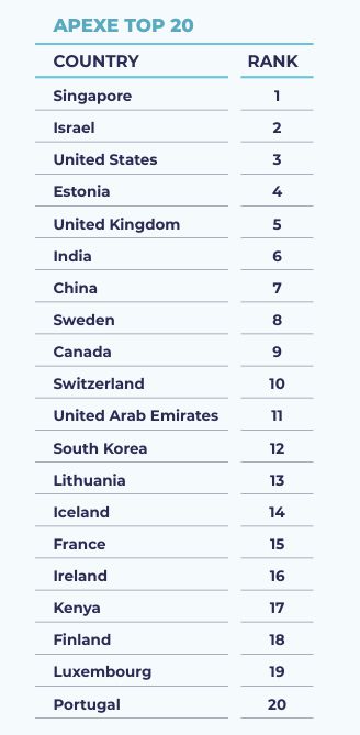보고서에서 1위를 차지한 국가는 싱가포르다. 2위는 이스라엘, 3위는 미국 순이었다. 스타트업 생태계의 절대 규모만 보면 미국이 더 크지만, GDP와 인구 규모 등을 감안한 상대점수에서는 결과가 변했다. 이어 에스토니아(4위), 영국(5위), 인도(6위), 중국(7위), 스웨덴(8위), 캐나다(9위), 스위스(10위) 순으로 이어졌다.