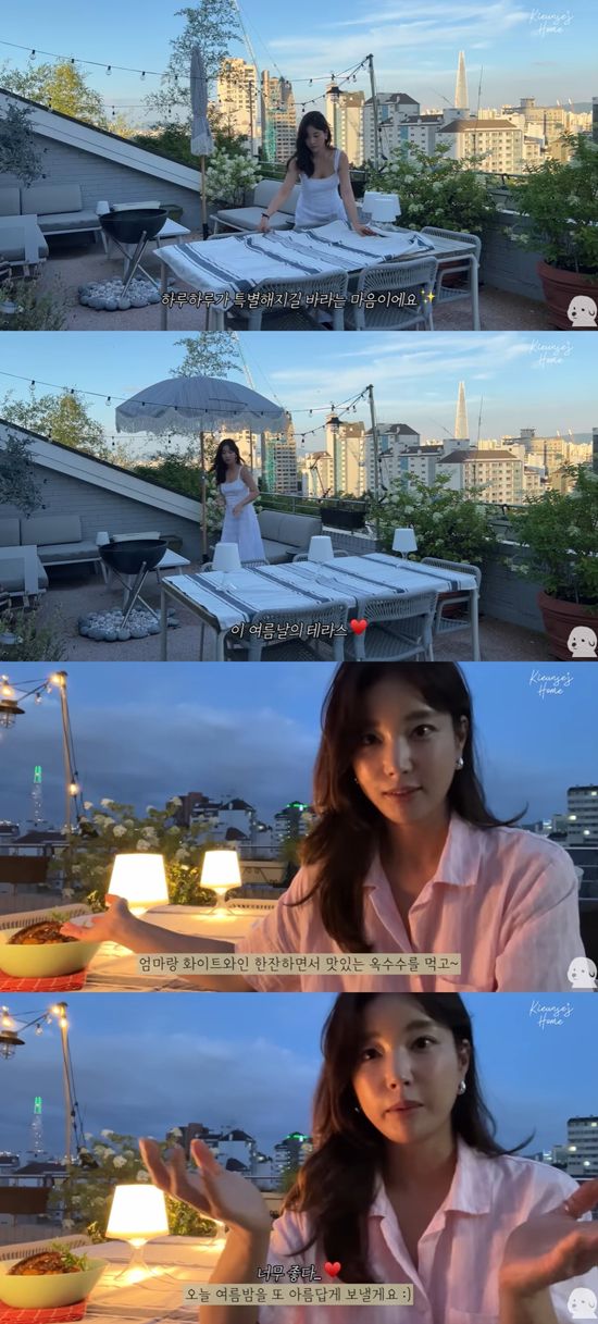 영상 속 기은세는 "집에 엄마가 오셔서 엄마랑 화이트 와인 한잔하면서 맛있는 옥수수를 먹으려고 한다. 여름밤을 아름답게 보내겠다"라며 야외 테라스를 공개했다. 화이트 인테리어와 꽃장식이 해외 호텔 느낌을 자아낸다.