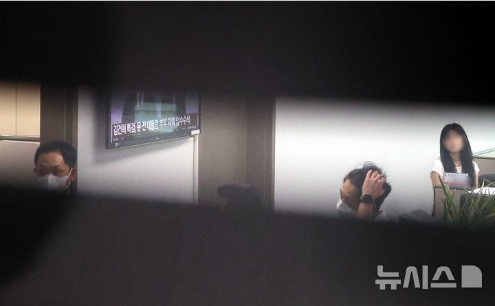 [서울=뉴시스] 조성봉 기자 = '김건희 특검' 관계자들이 ’양평고속도로 특혜의혹'과 관련해 25일 오전 서울 여의도 국회 의원회관 김선교 국민의힘 의원 사무실에 압수수색을 하고 있다. TV화면에 '김건희 특검'이 윤석열 전 대통령 부부 자택 압수수색 중이라는 자막이 눈에 띄고 있다. 2025.07.25. suncho21@newsis.com |