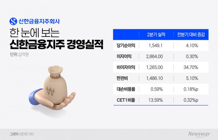 신한금융은 25일 오후 인터넷·모바일 생중계를 통해 2분기 경영실적을 발표했다. 신한금융의 2분기 순이익(1조5491억원)은 전년 동기 대비 8.7% 증가했고, 상반기 누적 순이익(3조374억원)도 10% 넘게 폭증했다. 반기 기준으로 사상 최대 실적이다.