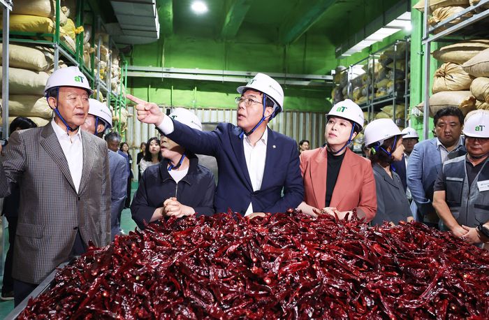 송언석 국민의힘 비상대책위원장 겸 원내대표가 폭우와 폭염으로 인한 농산물 물가 대응 점검을 위해 25일 경기도 이천시 대월면 aT 한국농수산식품유통공사 이천비축기지를 방문해 비축 고추 등을 살펴보고 있다. [사진 출처 = 연합뉴스]