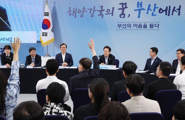25일 부산 부경대에서 이재명 대통령이 참석한 가운데 열린 타운홀미팅 ‘부산의 마음을 듣다’ 간담회에서 시민들이 발언권을 요청하고 있다. 연합뉴스