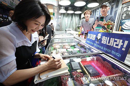 (인천=연합뉴스) 홍해인 기자 = 김혜경 여사가 25일 인천 계양산전통시장을 방문해 한 상인의 요청으로 이재명 대통령 저서에 서명을 하고 있다. 2025.7.25 [대통령실통신사진기자단]