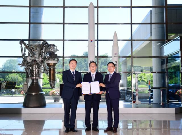누리호 기술이전 계약 체결식이 진행된 25일 대전 유성구 한국항공우주연구원에서 관계자들이 함께 기념사진을 찍고 있다. 왼쪽부터 손재일 한화에어로스페이스 대표이사, 윤영빈 우주항공청장, 이상철 항우연 원장. 항우연 제공 |