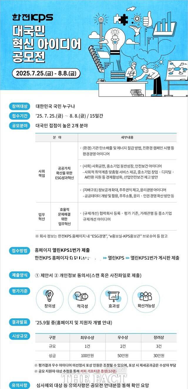 [더팩트ㅣ나주=김동언 기자] 한전KPS가 7월 25일부터 8월 8일까지 '2025 대국민 혁신 아이디어' 공모전을 개최한다.