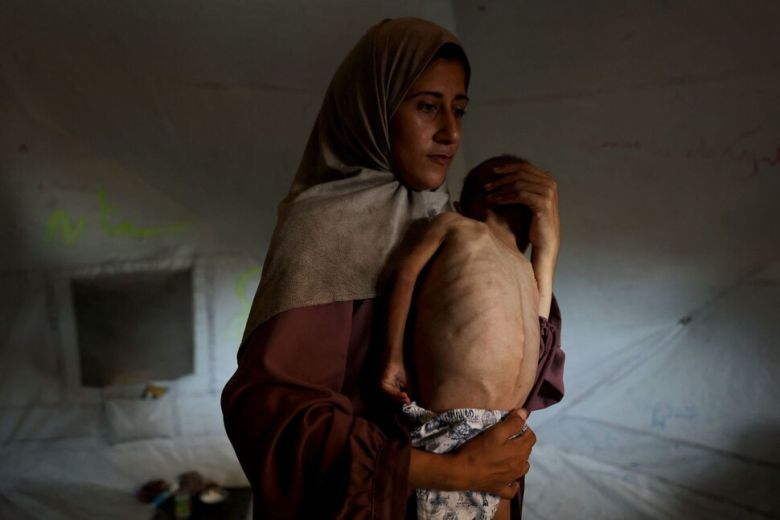 24일(현지시각) 31살의 팔레스타인 여성 히다야가 영양실조 증상을 보이는 18개월된 아들을 안고 가자북부 가자시티의 서쪽 샤티 난민 캠프 텐트 안에 있다. 가자시티/AFP 연합뉴스 |