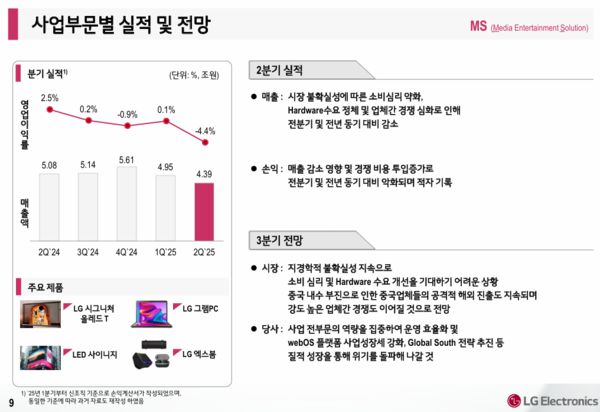 김창태 LG전자 최고재무책임자(CFO)는 "미국 관세정책 변동성 중동 지정학적 리스크로 인한 소비 심리 회복 지연 등 비우호적 경영환경이 지속돼 전년동기대비 매출이 하락했지만 구독 온라인 직접판매(D2C) 주력 기업(B2B) 사업 등을 중심으로 질적 성장 기반을 강화했다"라며 "미국 관세 비용 부담과 TV 사업 시장 수요 정체 및 경쟁 심화로 전년동기대비 영업이익이 축소했지만 그 외 사업부는 운용 효율화 등을 통해 전년동기 수준 또는 전년동기대비 개선한 안정적 수익성을 확보했다"라고 밝혔다.