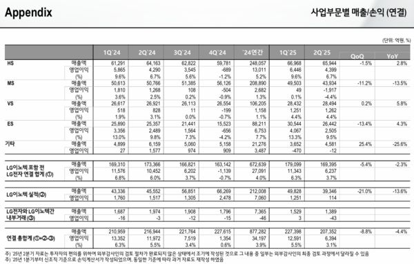 한국채택국제회계기준(K-IFRS) 연결기준 2025년 2분기 LG전자 매출액과 영업이익은 각각 20조7352억원과 6394억원이다. 매출액은 전기대비 8.8% 전년동기대비 4.4% 감소했다. 영업이익은 전기대비 49.2% 전년동기대비 46.6% 급락했다.
