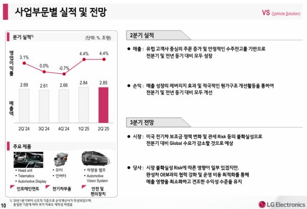 홈어플라이언스설루션(HS)사업본부(가전) 차량용설루션(VS)사업본부(전장) 에코설루션(ES)사업본부(냉난방공조, HVAC)는 2분기 기준 최대 매출액과 영업이익을 달성했다.