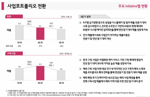 2분기 B2B 매출액은 6조2000억원이다. 전기대비 4% 부족하지만 전년동기대비 3% 넘쳤다. B2B는 각 사업본부별 B2B 매출 총합이다. 같은 기간 구독 매출은 6조3000억원이다. 전기대비 13% 전년동기대비 18% 상회했다. VS사업본부를 제외한 사업본부의 구독 계약 매출이다.