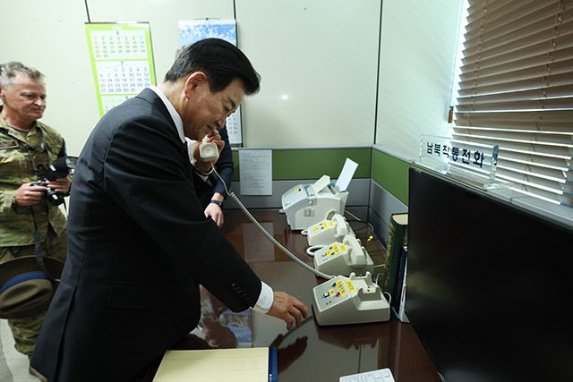 ▲ 25일 정동영 신임 통일부 장관이 첫 일정으로 판문점에 방문해 남북직통전화 상황을 점검하고 있다. ⓒ통일부