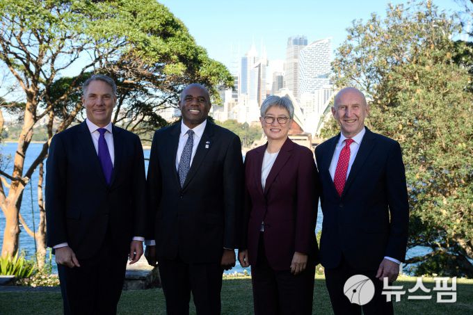 [시드니 로이=뉴스핌] 장일현 특파원 = 리처드 말스 호주 부총리와 데이비드 라미 영국 외무장관, 페니 웡 호주 외무장관, 존 힐리 영국 국방장관(왼쪽부터)이 25일(현지시간) 호주 시드니에서 열린 호주-영국 장관급 협의(AUKMIN)에 앞서 사진을 찍고 있다. 이날 양국은 50년 짜리 안보조약을 체결하기로 합의했다. 2025.07.25. ihjang67@newspim.com |