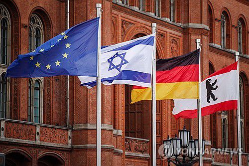 독일 베를린 시청에 걸린 이스라엘 국기(왼쪽 두번째)와 독일 국기(세번째)[EPA 연합뉴스 자료사진. 재판매 및 DB 금지]