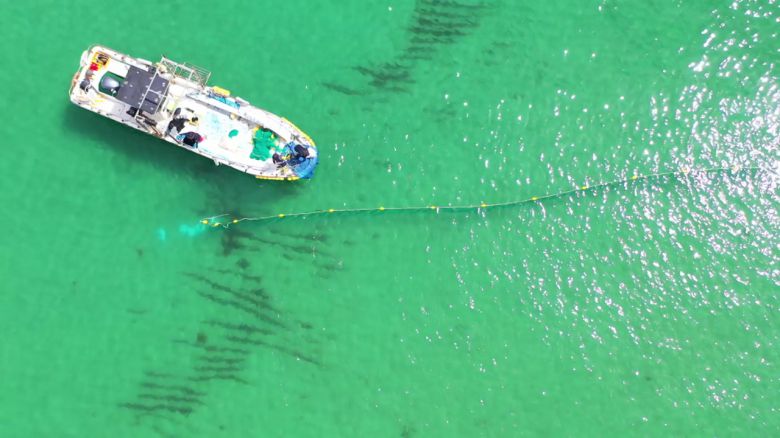 수영 한계선 부근에서 그물을 바닷속으로 내리는 작업이 한창입니다.