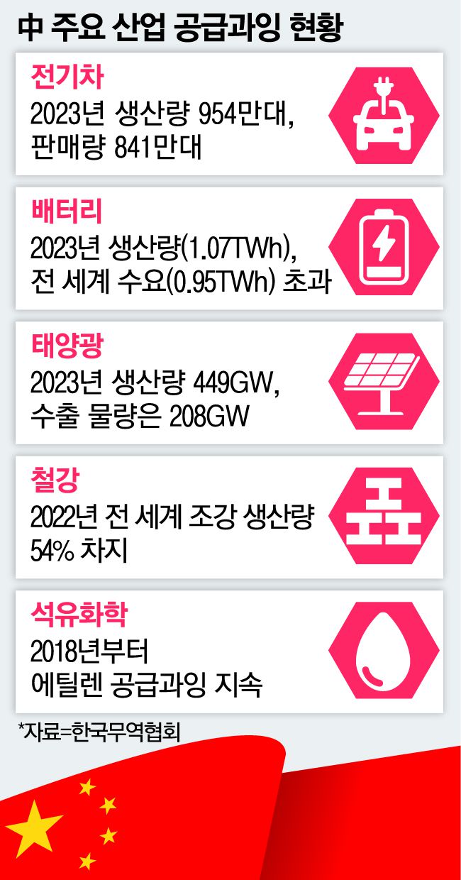 저가 경쟁의 가장 큰 원인은 중국 내 공급과잉이다. 일례로 전기차 생산량은 954만대(2023년 기준)에 이르지만 실제 판매량은 841만대에 그쳐 113만대의 초과 공급이 발생했다. 배터리 생산량도 전 세계 수요를 웃돌고 있으며, 국내 수요를 훌쩍 넘어선 태양광의 경우에는 ‘밀어내기 수출’이 한창이다. 철강과 석유화학은 공급과잉과 수요 둔화 등으로 이미 감산에 들어갔다.