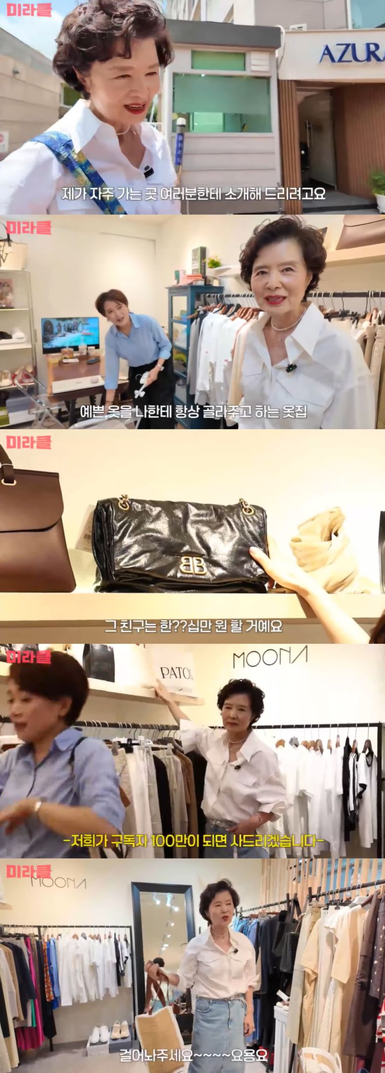 윤미라는 보테가베네타, 셀린느 등 명품 브랜드의 가방의 가격을 물어보며 관심을 가졌다. 윤미라가 제작진에게 "이것 좀 하나 사주시죠?"라고 말하자, 제작진은 "(구독자) 100만 되면 사드리겠다"라고 말했다. 이에 윤미라는 "아직 안 됐냐"라고 덧붙여 눈길을 끌었다.