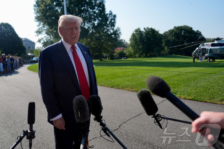 25일(현지시간) 도널드 트럼프 미국 대통령이 스코틀랜드로 떠나기 전 워싱턴 백악관에서 취재진 질문에 답하고 있다. 2025.07.25 ⓒ 로이터=뉴스1 ⓒ News1 김지완 기자 |