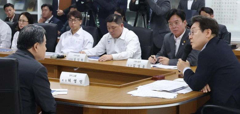 “나도 산업재해 피해자” 이재명 대통령이  25일 경기 시흥시 SPC 삼립 시흥 공장에서 열린 산업재해 근절 현장 노사간담회에서 허영인 SPC그룹 회장(왼쪽)과 대화를 나누고 있다. 이 대통령은 “똑같은 현장에서 똑같은 방식으로 똑같은 사고가 반복되는 건 문제가 있다”며 잇달아 사망 사고가 발생한 SPC를 질타했다. 시흥=대통령실사진기자단