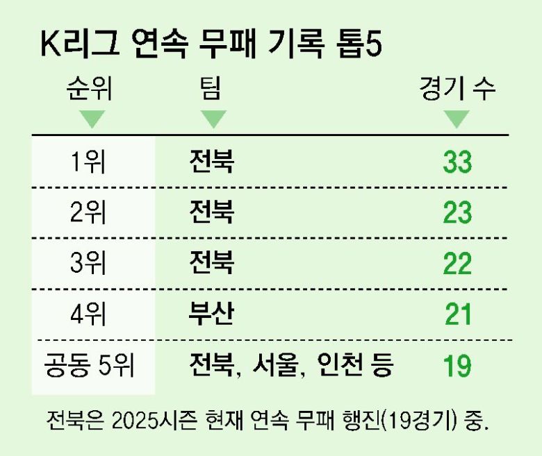 프로축구 K리그1(1부)에서 무패 행진을 이어가고 있는 전북의 거스 포옛 감독(58·우루과이)은 23일 강원과의 23라운드 안방경기를 2-0 승리로 이끈 뒤 이렇게 말했다. 올 시즌 4년 만의 왕좌 탈환에 도전하는 전북은 강원전 승리로 5라운드부터 시작된 무패 행진을 19경기(14승 5무)로 늘렸다. 전북은 26일 광주와의 방문경기에서 패하지 않으면 20경기 무패를 달성하면서 K리그 통산 연속 경기 무패 기록 순위에서 단독 5위가 된다. 이 부문 1위는 2016년 전북이 작성한 33경기 무패다.