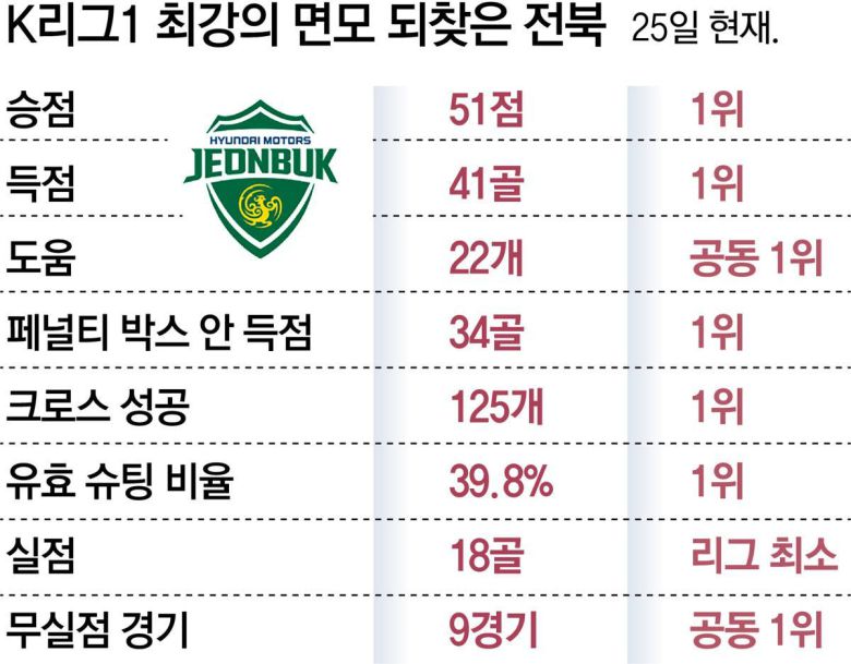 전북은 지난 시즌엔 리그 12개 팀 중 최다 실점(59골)을 했고, 득점(49골)은 7위에 그쳤다. 하지만 올 시즌엔 25일 현재 리그에서 실점(18골)이 가장 적고, 가장 많은 41골을 터뜨리면서 완벽한 ‘공수 조화’를 자랑하고 있다. 포옛 감독이 추구하는 ‘롱볼’ 전술이 완벽하게 팀에 이식되면서 과거 ‘닥공(닥치고 공격)’으로 불렸던 강력한 공격력을 되찾은 것이다.