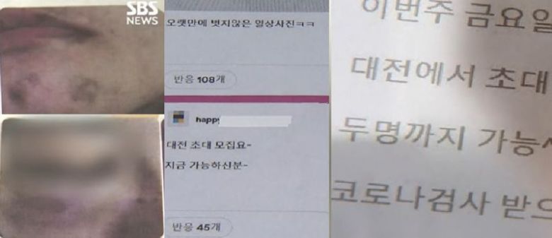 B씨가 남편으로부터 폭행을 당한 뒤 찍었다고 주장한 증거 사진(왼쪽), 남편 A씨가 온라인에서 남성들을 모집한 글. 출처=SBS뉴스 갈무리 |