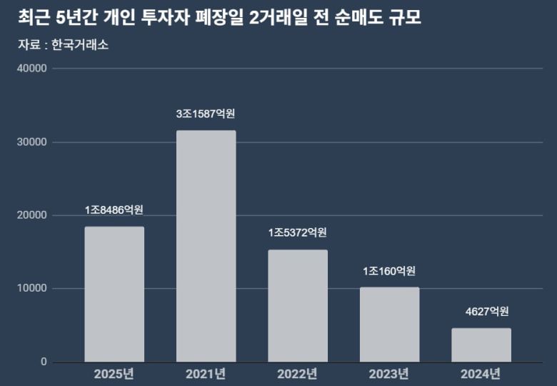 주식 투자가 활발해진 2019년부터 폐장일 2거래일 전 개인 투자자의 순매도 규모는 매년 조(兆) 단위를 기록했습니다. 특히 주식시장이 강세일수록 매도 규모가 컸습니다. 이른바 ‘동학개미운동’에 힘입어 코스피·코스닥지수가 뛰었던 2021년에는 폐장일 2거래일 전 개인의 순매도 규모가 총 3조1587억원에 달했습니다.