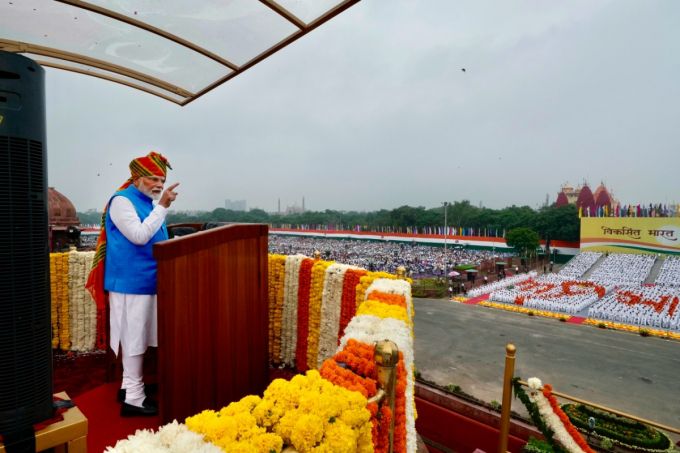 인도 뉴델리에서 2024년 8월 15일 목요일, 인도 독립기념일 기념행사 중 나렌드라 모디 인도 총리가 17세기 무굴 시대의 붉은 요새 기념물에서 국민에게 연설하고 있다. /사진=AP/뉴시스 |