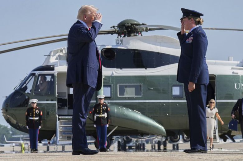 도널드 트럼프 미국 대통령이 25일(현지시간) 메릴랜드주 앤드루스 합동기지에서 스코틀랜드로 향하는 에어포스원에 탑승하기 직전 멜리사 돔브록 공군 제89비행단 부사령관의 안내를 받으며 경례하고 있다. AP연합뉴스 |